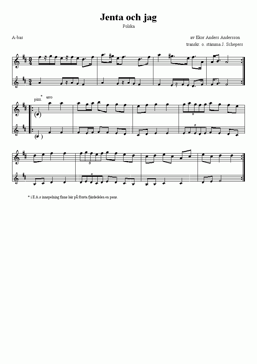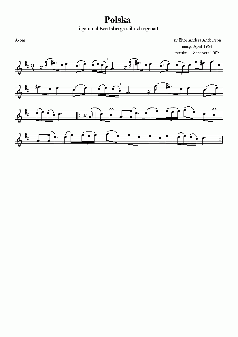 Die folgenden Noten sind transkribiert nach Einspielungen seiner eigenen Stücke von Ekor Anders, Älvdalen, aus dem Jahr 1954. Verzierungen sind nicht berücksichtigt. Diese Aufnahmen sind teilweise bei der schwedischen Plattenfirma Universal auf CD erhältlich (in: 'The Sonet Folk Series'). |